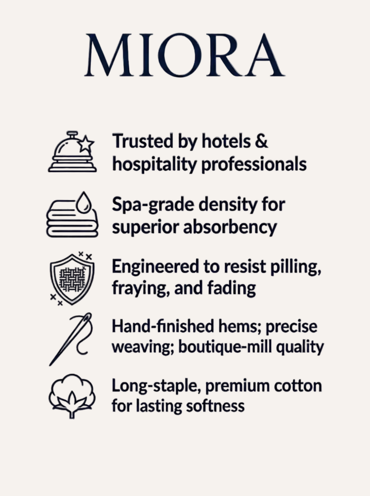 Your towels are an investment in your daily sanctuary. With the proper care, the cloud-like softness and superior absorbency of MIORA cotton will bloom and improve over time.