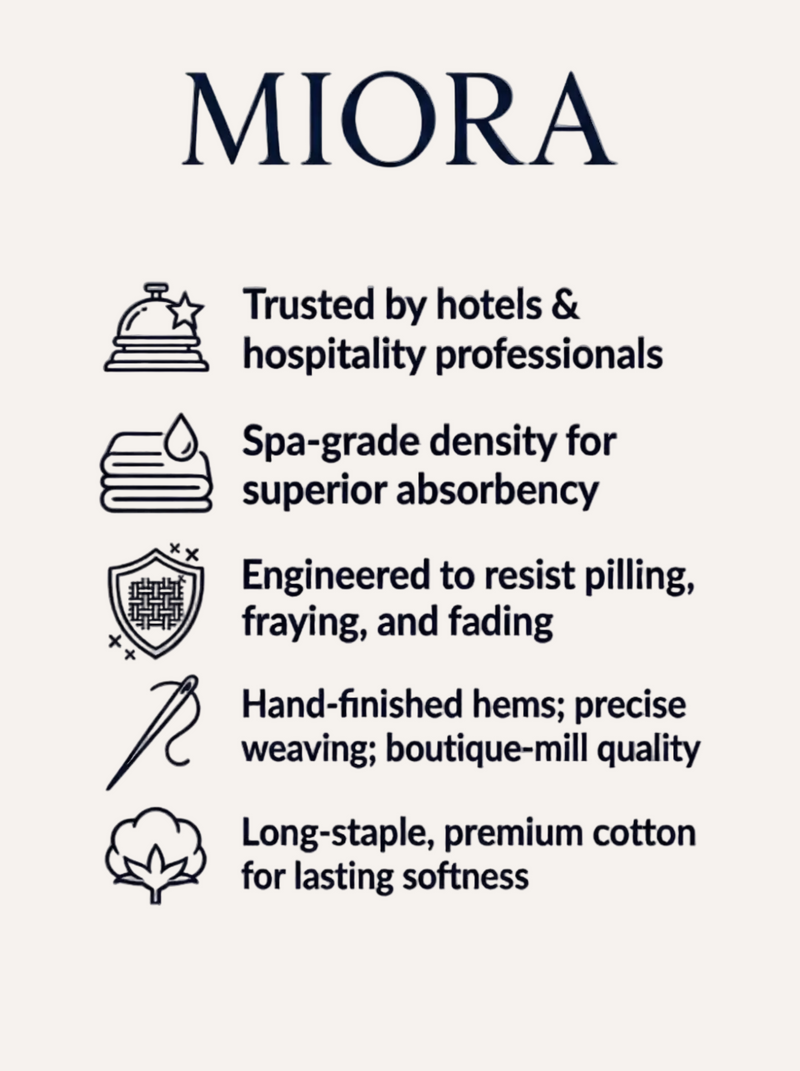 Every MIORA towel begins with long-staple cotton, woven for lasting softness and balance. Each thread, fold, and finish is guided by our belief that luxury should feel effortless — calm in every detail, beauty in every touch.